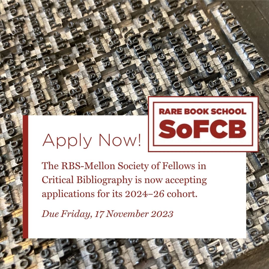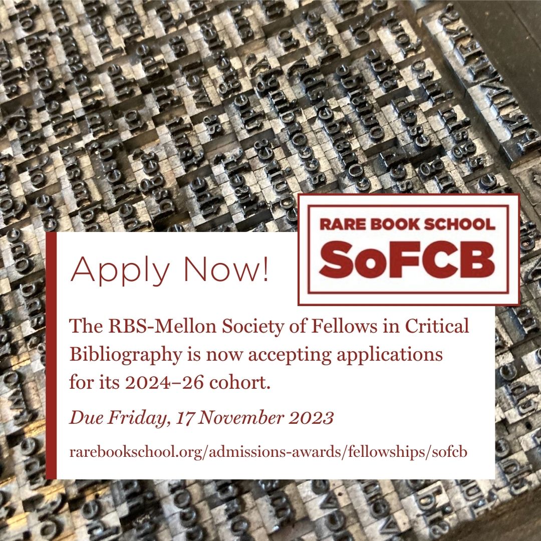 Rare Book School’s (SoFCB) invites applications for its 2024–26 cohort of Junior Fellows. The deadline is Friday, 17 November 2023.