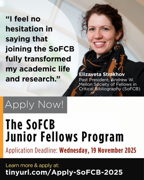 > We are inviting applications for the 2026 cohort of Junior Fellows. The SoFCB is a community of scholars working across disciplines to advance the study of texts, images, and artifacts as material objects. Ten Junior Fellows will be selected to join the SoFCB in 2026; they may become Senior Fellows after completing two years of the fellowship's required activities in good standing. The application deadline for the SoFCB Junior Fellows Program is Wednesday, 19 November 2025, at 11:50 pm ET. To learn more about the fellowship program and application, please visit: www.tinyurl.com/Apply-SoFCB-2025 <http://www.tinyurl.com/Apply-SoFCB-2025>. For any questions about the SoFCB Junior Fellows Program, please email sofcb_staff@virginia.edu <mailto:sofcb_staff@virginia.edu>.